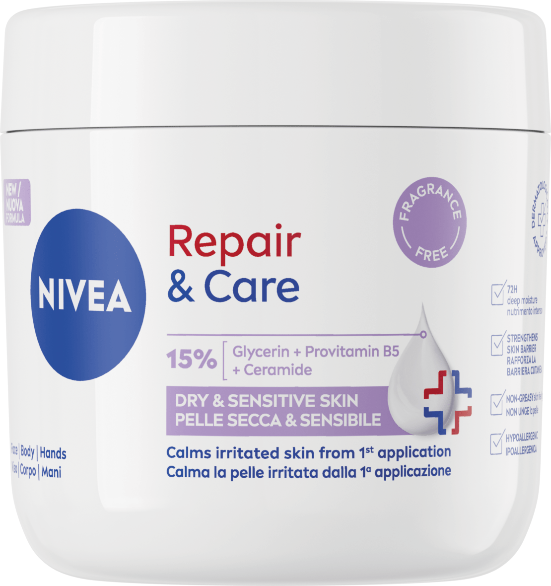 Незалежно від того, чи маєте ви справу зі стягнутістю, лущенням або постійною сухістю, лінійка NIVEA «Відновлення та догляд» допоможе відновити комфорт і пружність шкіри.