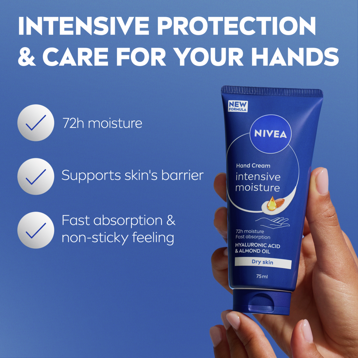 Крем для рук "Інтенсивне зволоження" для сухої шкіри з гіалуроновою кислотою та мигдальною олією забезпечує зволоження до 72 годин і швидке поглинання, залишаючи руки помітно гладкими. Протестовано під дерматологічним контролем.
