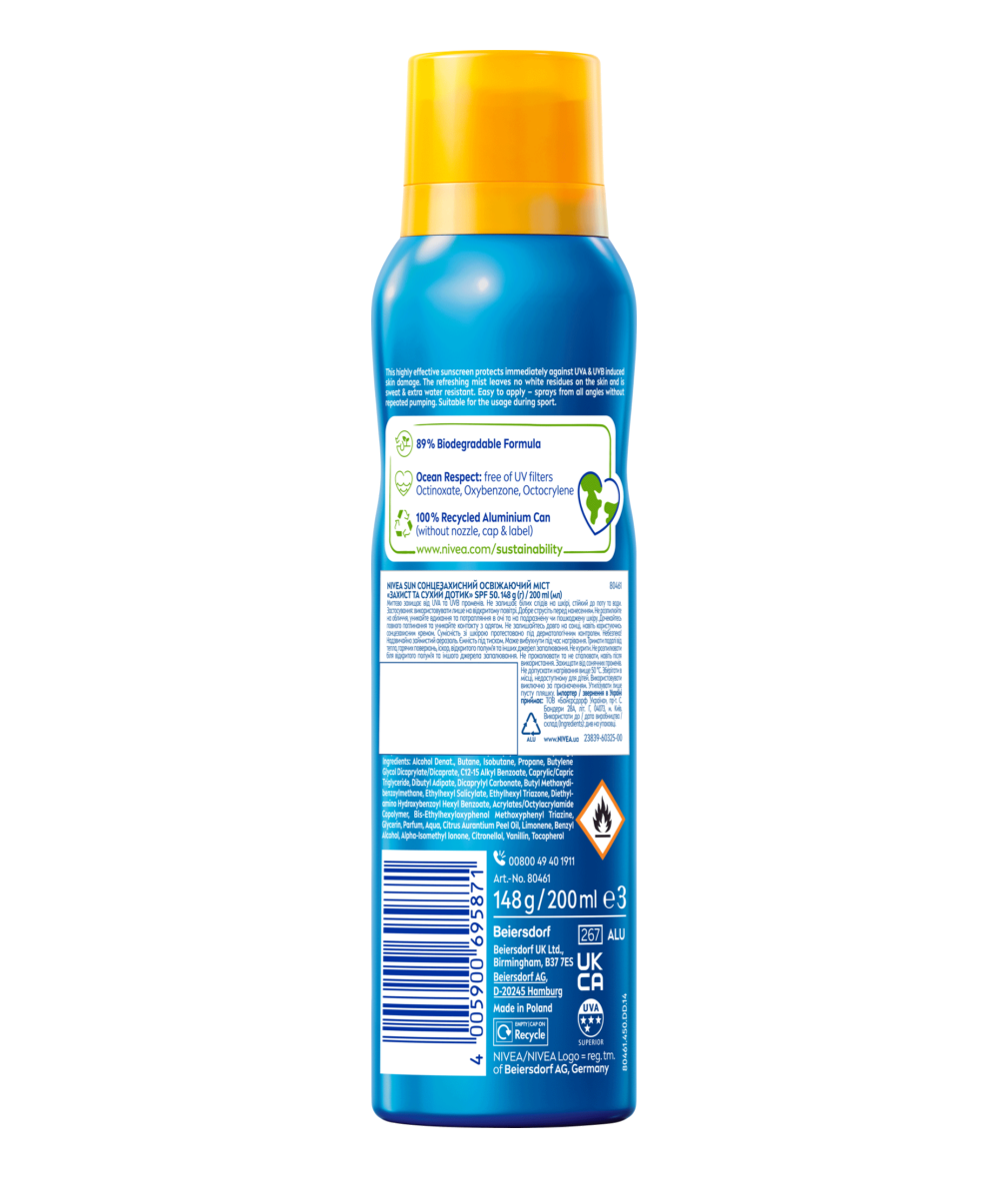 - Екологічність – формула з бережним ставленням до океану, не містить UV-фільтрів Octinoxate, Oxybenzone та Octocrylene. 89% біорозкладна формула та 100% перероблений алюмінієвий балон (без клапана, кришки, етикетки).