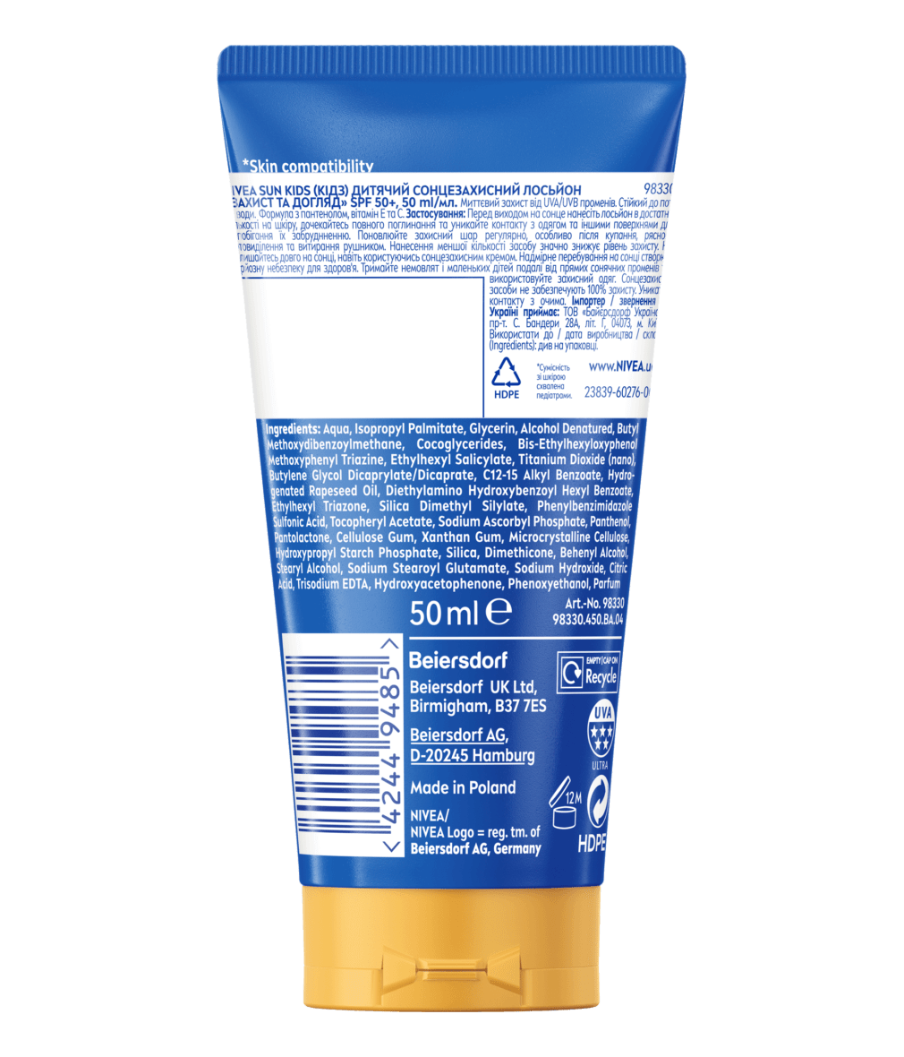 Надійний захист 5 в 1 від UV-променів, адаптований до потреб ніжної шкіри дітей. Миттєвий захист від UVA/UVB променів з формулою, стійкою до поту та води. NIVEA SUN Kids (Кідз) Дитячий сонцезахисний лосьйон "Захист та догляд" SPF 50+.